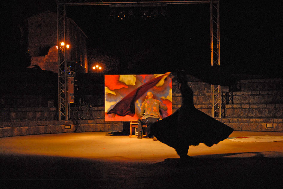 Starting with a large blank canvas, music and dance (Vanessa Valle) with an improvised choreography, a work of art is born before the eyes of the public. A spectacle that leaves an emotional all spectators.